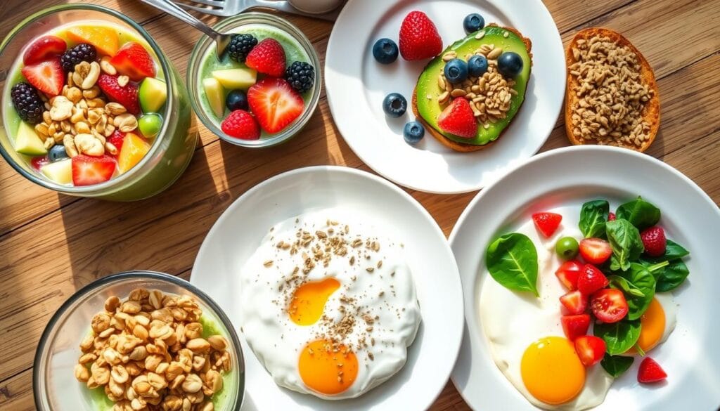 Try oatmeal with berries and nuts, or Greek yogurt with chia seeds and fruit. Eggs with spinach and whole grain toast are also good. These meals give you sustained energy.